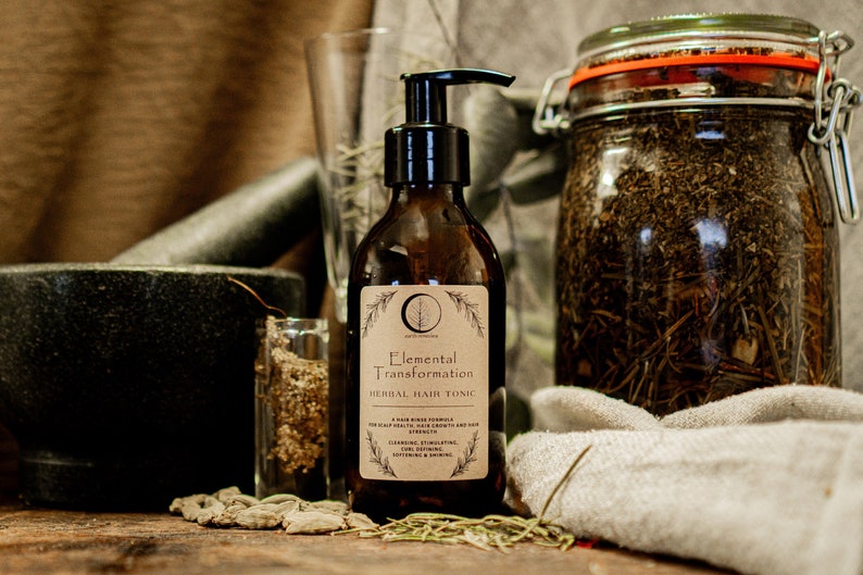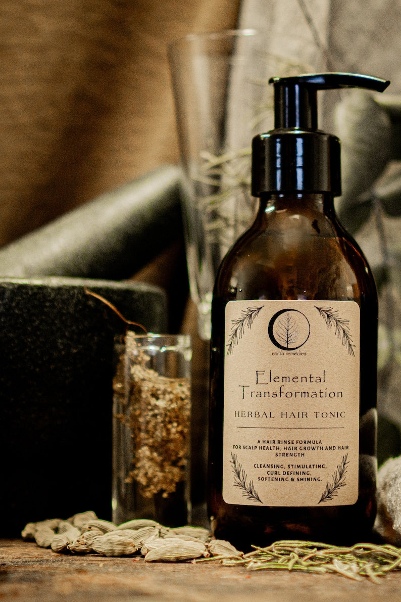 Elemental Transformation is one of our Herbal Hair Tonics; a natural hair rinse and scalp formula, packed with anti-frizz and plant allies. It focuses on hair strength and stimulating the scalp without making hair oily.